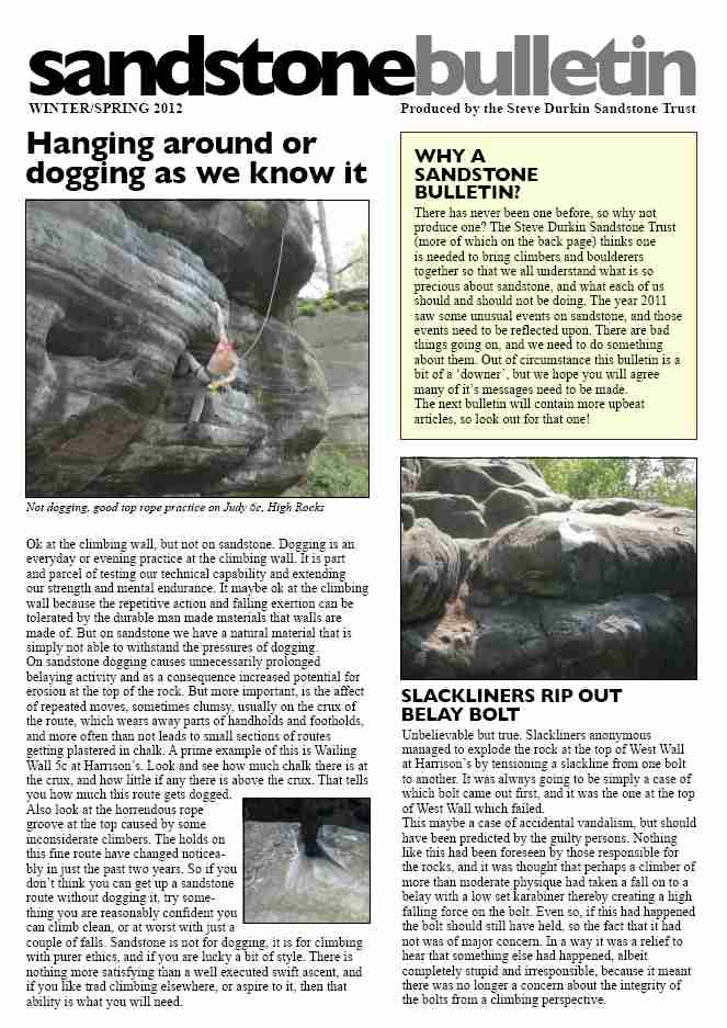 Sandstone Bulletin The main publication of the Steve Durkin Sandstone Trust, published in printed form and available from climbing outlets, shops and Climbing Walls locally. Available here as a download in .pdf format: Winter Spring 2012 Summer 2013
